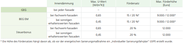 Das Gebäudeenergiegesetz (GEG) schreibt für Innendämmungen keinen U-Wert vor. Der in ihr aufgeführte U-Wert von 0,24 gilt nur für Außendämmungen. Die Bundesförderung für energieeffiziente Gebäude (BEG) fördert Innendämmungen als Einzelmaßnahme (EM) bei Fachwerk-Fassaden ab einem U-Wert von 0,65 und bei sonstigen erhaltenswerten Fassaden ab einem U-Wert von 0,45. Die gleichen U-Werte gelten auch für den „Steuerbonus“.